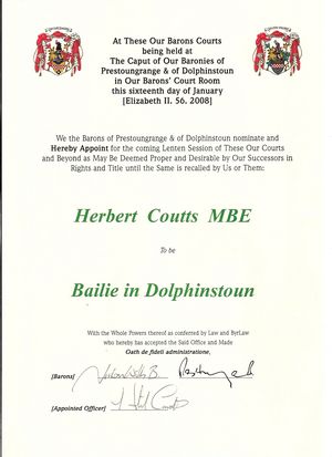 Dr Julian Wills of Dolphinstoun, Baron of Dolphinstoun, was pleased to announce at the Session of the Courts held on January 16th 2008 that Herbert Coutts, recently honoured by HM The Queen as Member of The British Empire [MBE], has been appointed Bailie in replacement of Anthony Gillingham. This new appointment runs from the Lenten Session of the Courts and thereafter until the same may be recalled.