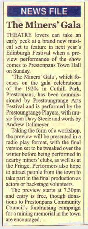 In 2011 the musical, The Miners' Gala, will tour local Miners' Clubs and make its way to the Edinburgh Fringe as well.