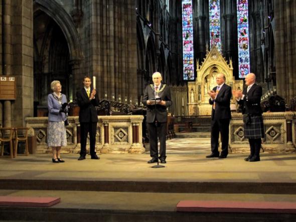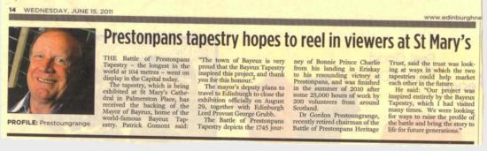 Amogst his words of welcome, The Lord Provost read a letter of Congratulations from the Maire de Bayeux, [LINKED HERE] whose own city's tapestry had inspired our own, whilst the French Consul assured us the Auld Alliance was intact. It was down to Gordon Prestoungrange to thank the Cathedral's staff on behalf of the Battle Trust most particularly Sarah Grotrian, for their three months of present and impending hospitality; and to assure the Lord Provost that, unlike his predecessor in 1745, he had no need to make the difficult choice between surrender, doing battle or accidentally leaving the Netherbow Port ajar so Lochiel and his clansmen could enter quietly!