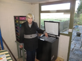 Nothing borrowed but two times new! We've always resisted a freezer in the garage, not because it's meant for cars but because it leads to forgotten stocks. But needs must and during the coming weeks and in Avril's build up to Christmas which she is going to deliver for all who can come, she needs somewhere to store the prototype pigs-in-blankets and more! And after we'd taken a brisk walk in the autumn air along Barn Lane to the oak tree marker, we arrived home to a white van delivery … no problems; we had a palet on which to stand the black freezer and it's here below to see. Not to be out-innovated, Julian and Laura had resolved to replace their admittedly rotten south side gate [installed 1979] but the new arrival was pretty boring. After considerable ridicule and critique the decoration seen has been installed …..