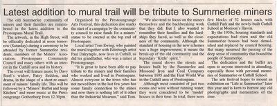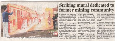 Whilst there is no trace today of either the Summerlee Company or the housing it built for the Prestongrange pit's mining families, Tom Ewing's new mural of the Summerlee community including old Cuthill School and Cuthill Park has already been widely welcomed and brings back many a memory. The mural is to be formally dedicated on February 28th and the occasion will include music by Davy Steele who of course stayed there and an arts festival dramatisation of life there.