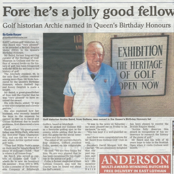 WELL-KNOWN East Lothian golf historian Archie Baird, 95, peacefully passed away on December 7 in North Berwick.