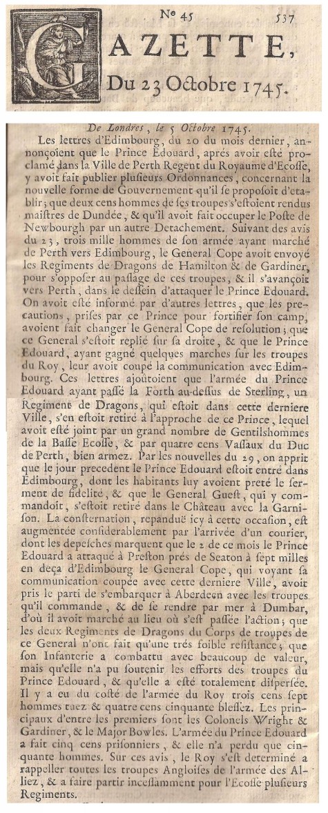 The Paris Gazette ..... reporting October 23rd 1745