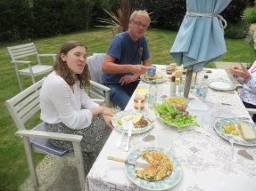 Fortunately we had unwittingly addressed OOTD … … because Lorna's back to work in London after her culinary success baking a Portuguese pastel de nata - that's egg custard tart coated with cinnamon to yumi! She made a stopover for lunch of Milton Royals/Nobles and lettuce and other vegetarian delights including frittata italiano, comté cheese and that camembert, despised as fetor ever since I brought it back from the Far Cotton Co-op. The Dolphinstouns said Hi to all including chauffeur Mathew but it was also Henry's Day-Back-at-Wellingborough from 2pm so that was priority. Our OOTD, Outfits of the Day, were not for goving, mindless goggling or gawping. Avril elected black three quarter length trews with white, black spotted red and black trimmed shirt, red coral necklace and red sandals. As I selected today's outfit I built from my bottle green strides and ensured complementary but contrasting socks and blue/green/red/ white checked shirt with personal silver neck chain topped with my treasured light tan waistcoat. For footwear I chose pale green plimsolls and donned my pale blue Akubra. As the image below shows Mathew and Lorna were both well attired!