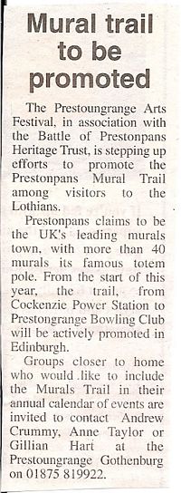 Prestonpans is the UK's leading historical murals town with 40+ murals now in place as well as our famous totem pole and we have sculptures due in 2008. And The Pans best mate in Scotland is at Invergordon where a mural programme began three years ago.