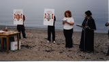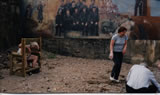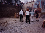 8. The Complaints heard and Defendants punished arose from the current activities of the Baronial Courts as a Scottish Charity e.g. delays in completion of building works, late supply of soft furnishings, destruction of flowers and disruption of meetings. The guilty parties here have received either time in the stocks and/ or fines payable in King Charles I coinage up to the 40/- maximum. Ken Hart who failed to fit curtains in time for Lady Prestoungrange's Birthday Celebration on April 1st is shown here settling amerciamentis or fines to the Baron - who is entitled to keep the proceeds. Also illustrated is Andrew Crummy, Convenor of the Murals Action Group of The Prestoungrange Arts Festival, who was set in the stocks and pelted with croisasants, fish and bananas for 5 minutes for consistent late arrival at meetings to the detriment of colleagues with young children.