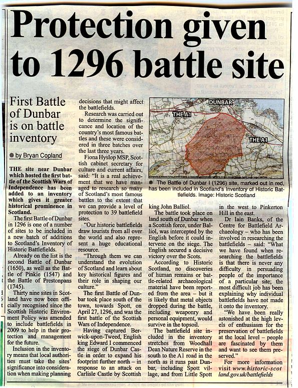 Our own Prestonpans battle which saw Prince Charlie's victory in 1745 was amongst the first listing along with Cromwell's victory at Dunbar in 1650 and Somerset's at Pinkie in 1547. Dunbar's earlier battle in 1296 which saw victory for England's King Edward I has only now been listed in the third grouping, whilst Tam Dayell's Royalist victory over the Covenantors at Rullion Green in neighbouring Mid-Lothian in 1666 featured in the second.