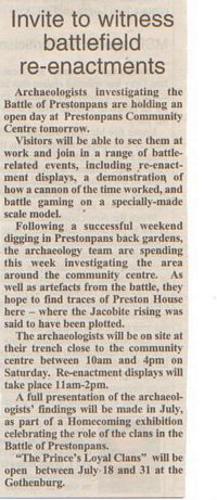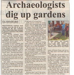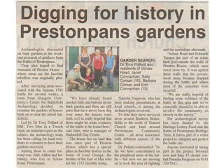 Tony Pollard and his world famous team of battlefield archaeologists were in town last month digging up people's back gardens and the grounds of the Community Centre. Their work is being undertaken for the Battle of Prestonpans 1745 Heritage Trust with Heritage Lottery support to track down any artefacts still remaining from the battle 264 years ago.