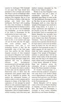 Written at any time Margulies’ work would deserve and earn a place of considerable significance in the admittedly large library of works on the ’45. But deliberately focusing as it does on The Run Up and on the Battle of Prestonpans itself at a time when the ‘people of Prestonpans’ have resolved to make living history of it gives it a unique significance and importance. It has become at once the ‘official’ script for the Battle Trust’s re-enactments and Martin Margulies has inevitably been invested as Colonel-in-Chief of the newly formed Alan Breck Prestonpans Volunteers. That is an outcome he can scarcely have expected when he first put his legal mind to work from his holiday home on South Uist.