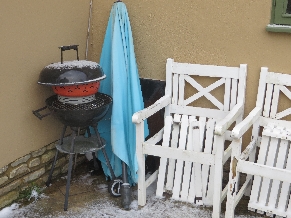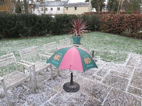 Only good for vertical rainfall in UK? Today is Umbrella day! It was tempting to believe that the British invented the umbrella since carrying one, black rolled, was a key part of the office gentleman's uniform. Like the officer's 'swagger' stick I proudly sported in the Royal Air Force. But of course it's been in use since prehistoric times in hot climates not to ward off the rain but as a shade, a parasol. The Gaelic word sgàilean is for a shade. Today's pictures from The Lodge show first the remains of our patio sun shade, its use closely associated with the barbecue set. Secondly, inevitably, memories of parasol uses in Port Vila in Vanuatu. A treasured souvenir is from Venice when we were caught in a shower! Which tale strongly reinforces the known folklore statistic that sales of umbrellas in the UK are highest after it stops raining rather than before. It's got tail end Charlie spot here today. All umbrellas are of course quite useless if the wind speed associated with the rain gets much above 15mph.