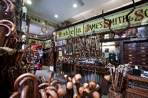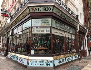 Who really invented umbrellas? The earliest recorded were parasols designed by the Egyptians around 1000 B.C. made from feathers or lotus leaves attached to a stick and were held by servants to offer shade to the nobility. Whilst English slang calls our rain protectors brollies the French make discrete provision for rain, parapluie, and sunshine, parasol. The particular word "umbrella" evolved either from the Latin umbella [an umbel is a flat-topped rounded flower] or from umbra meaning shaded or shadow. The first recorded written usage was in 1610. London's byword for the umbrella is James Smith who founded the enterprise in 1830 with manufacture and retailing on the same premises. In 1851, Samuel Fox invented the lightweight steel frame and umbrellas grew in popularity. James Smith II was one of the first makers to use Fox's frames & his business grew to the point where he had to move to a larger premises in 53 New Oxford Street where the shop remains to this day - a Grade 2 Listed structure seen below.