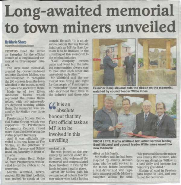 PRESTONPANS MINERS' MEMORIAL to be unveiled June 10th @ 11am