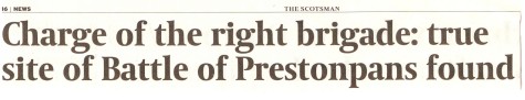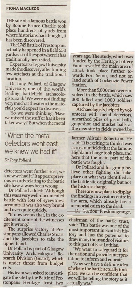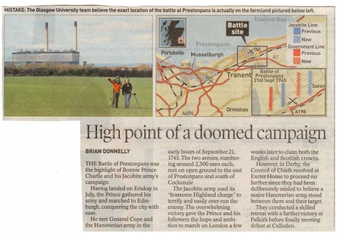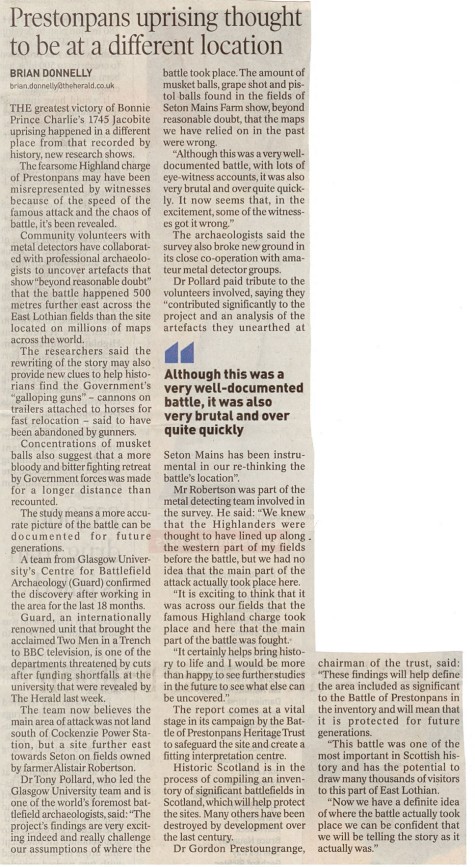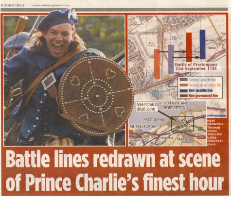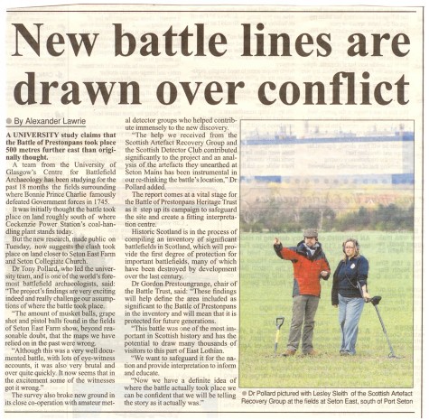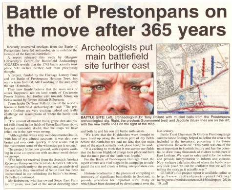 .... STV, BBC & Forth Radio, The Herald, The Scotsman, Edinburgh Evening News, East Lothian Courier, East Lothian News, St Louis Globe-Democrat the list went on, each wanting to carry the startling news. The Battle of Prestonpans almost certainly took place some 500 metres farther east than had been traditionally thought. Tony Pollard from GUARD at Glasgow University had the evidence to present his case. As such the battle took place on the lands of East Seton farmer Alastair Robertson rather than of Scottish Power.
