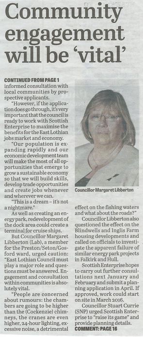More than a few in the Coastal Regeneration Alliance [CRA] are acceptive that some compatible industrial activity might follow on at the old site of Preston Links Colliery/ Cockenzie Power Station. But none has signed up for destroying the local fishing industry, cutting the coast road and the John Muir Way and despoiling the battle site let alone the impact on residential housing. Such notions are widely regarded as dumb, and whoever proposed them or voted for them in principle at East Lothian Council should think very seriously. Even to suggest it was crass. Who are these dreamtime folk at Scottish Enterprise who think we locally are mere pawns on their chess board?