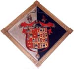 These photographs have so far not been located but one very fine example of a funeral hatchment, 978mm square with oil paint on tin, hangs on the wall of the church today as depicted below. It is for Harriet, daughter of the 8th Earl of Wemyss who married Sir George Grant-Suttie of Balgone and Prestoungrange and who died in 1858.