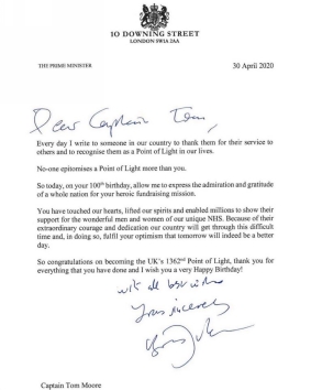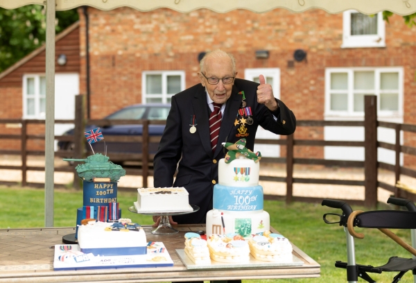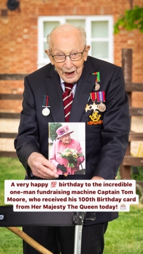 Tapadh-leit; it's Captain Tom's Birthday …. Co-là-breith a ’Chaiptein Tom. Saying that in a suitable manner was always going to be a challenge amidst the clamour in the tabloids for a knighthood! On his 100th birthday, which is of course today, he's was very much hoping to get a card/ telegram from HM The Queen to the 140,000 already received. She did not disappoint but HM also thought outside that box and designated him as Honorary Colonel of the Army Foundation College in Harrogate, a centre for young soldiers. Although grateful he immediately confirmed he'd rather be known as Captain Tom. [Promotion like that would make me a Group Captain in the Royal Air Force.] The 1st Battalion The Yorkshire Regiment, successor to his own Duke of Wellington Regiment in WWII, gave him its own minted medal [added left in photo below]. And the Army flew two helicopters past matched by a Royal Air Force Spitfire and Hurricane. I'll be fascinated by what he makes of VE Day though because he was still in Asia then and waiting for VJ Day on August 15th. His central worn medal is the Burma Star [which he shares with HRH Prince Phillip] for service with tanks fighting the Japanese in the Arakan campaign. What more can be said; I'm in aposiopesis, silent.
