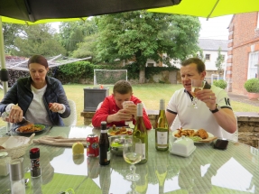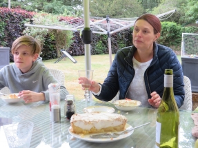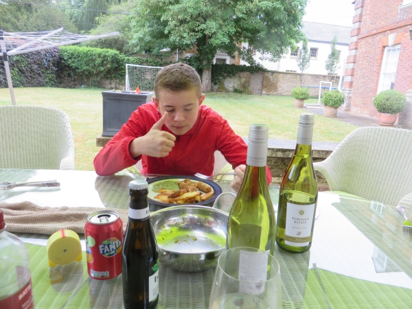 Proudly Honoured at The Manor House. The good weather had left us and rain not only threatened but delivered modestly. But the Manor's two new Sunshades had arrived and the Dolphinstoun's were determined to create the Fish & Chips necessary for the National Day. The large picture depicts star footballer Henry Yr. of Dolphinstoun tucking in - having just left the field behind £50 richer for having hit the crossbar at first attempt from a full lawn's length. He had wisely as it transpired declined Double to £100 or Quits to £0 if he could repeat the feat at his next kick. On the table in front of him is a bottle of the now legendary Bacchus Fumé from Dorset's Furleigh Wine Estate and another of Avril's 4% Binary Beer tasting like wine. Below left a wider display of Fish & Chips is shown and on the right Laura's excellent lemon meringue dessert and at her side Elliot Yr. of Lochnaw.