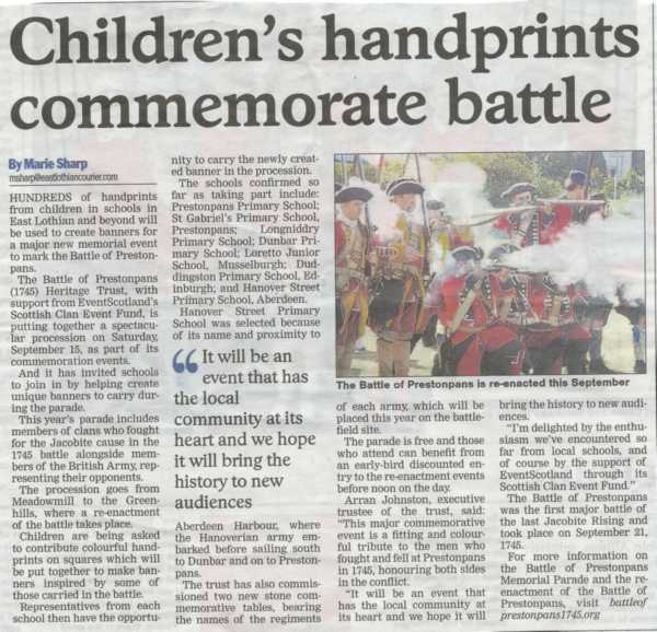 Hundreds of handprints from children in schools in East Lothian and beyond will be given the chance to help create banners for a major new memorial event to mark the Battle of Prestonpans this year - September 15th to be precise!