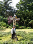 Janice Simpson, who created the totem pole at Elvingston Science Centre By Gladsmuir in East Lothian, is a nostalgic American with totem memories. It was her husband David who prevailed upon her to come and dwell amongst us. The pole she created is topped with the mythical Thunderbird and carries symbols of animals dear to her heart. Its obverse side presents an owl such as inhabits Elvingston Hall's magnificent parklands. Janice Simpson is pictured below with her pole and a very much alive dog related to the coyotes.