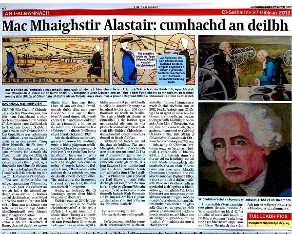 P.S. For those following our Gaelic initiatives in Prestonpans, the entire text of the website and Official Guide to the upcoming Scottish Diaspora Tapestry will appear in Gaelic by year end 2013.
