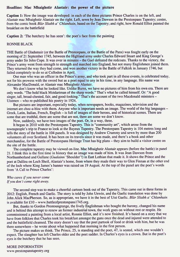 Ronald Black reports our story ... so far ... in the piece attached below which appears today, April 27th in The Scotsman. If your Gaelic is absent or rusty, the translation follows.