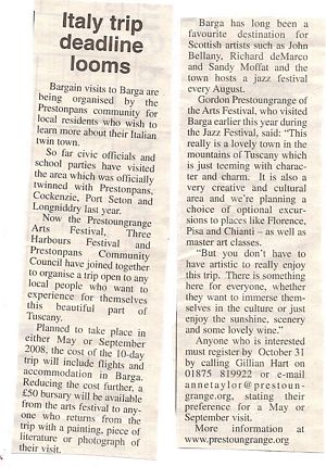Umpteen of us have vowed we will make the visit to Barga in Tuscany's northern mountains with which 'most of EH32' twinned in September 2006 ... and now the Prestoungrange Arts Festival/ Three Harbours and Prestonpans Community Council have put together a package for 2008.