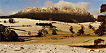 KAT has also now won local Council support and $A 40 000 funding for an Exhibition Hall of Fame … each year at the time of the Tasmania-wide Ten Days on the Island a ten artist murals contest is being run, with the winner taking up space for ever in The Hall of Fame. The dates for 2003 are already known as March 28th/April 6th. In recent years as well as painting new murals, KAT in Sheffield also predated Ely's use of the Living Mural concept in partnership with the Mount Roland Folk Festival. Mount Roland as can be seen below dominates the Kentish plains.