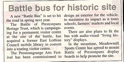 Secondly, and somewhat exuberantly, the Trustees have decided to acquire a former East Lothian Mobile Library and to deck it out as a touring Visitor Centre. The mobile library is pictured below [parked up in a used truck lot in West Lothian!]. It will hit the road in the Spring. The great virtue of such mobiity of course is that it can take our Campaign to schools, Farmers' Markets, any events venues and more besides. And it can always be at Meadowmill when needed there for the critically significant days each year. Kristine Cunningham, who led the resourcing in 2007, believes it's a perfect answer. The Arts Festival team is already commissioned to create an exterior for the Battle Bus that will maximise its impact and there are plans for very audible and visible Living History too.