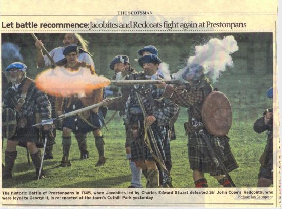Since July 26th when the Prestonpans Tapestry made its debut on the nation's stage, just about every newspaper/ news-sheet across the Highlands, the nationals here in the Lowlands, the Courier and News in East Lothian, STV, BBCtv, BBC Radio 2's Chris Evans Show, BBC Radio 4, BBC Alba, Reuters [they certainly reached the Natal Mercury in South Africa] .... websites by the dozen, Facebooks, YouTubes and more .... all have carried our story and it frequently includes Ian Green's brilliant Greentrax CD and the 2010 Re-enactments in Cuthill Park.