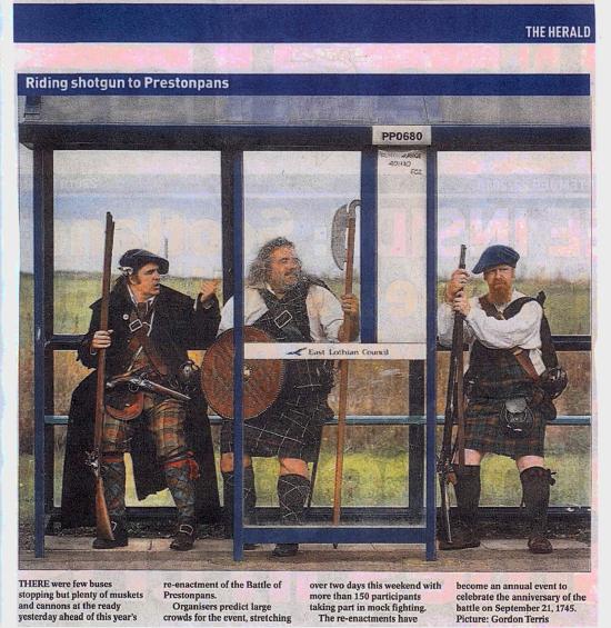 .... in particular the notion of taking the bus or car to get to the battle itself. The Guardian had Highland Bling; The Herald Riding Shotgun; EL News suggested Forming an Orderly Queue for the 1745; and The EL Courier opted for the automobile with the injunction to ditch that and the mobile phone!