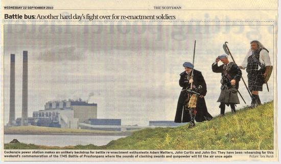 Each also carried the story of what was planned. Intriguingly Andrew Hillhouse's fine new painting of Marching the Riggonhead Defile in 1745 took the fancy of the EL News - the painting was unveilied after the 2010 Anniversary Walk by 60+ at 5 am in the morning. And The Scotsman liked Tony Marsh's image of Alan Breck's Highlanders outside Cockenzie Power Station - they're good friends of the Battle & Arts Trusts and the upcoming weekend venue for the Prestonpans Tapestry November 27th/ 28th.