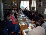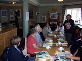 The second gathering of the Lowlands-based embroiderers at The Prestoungrange Gothenburg on July 24th saw the formal creation of THE EMBROIDERER'S LIST of numbered panels with named volunteers. It takes the numbering from the published booklet on the Tapestry and 'reserves' panels for the volunteers on a first come first agreed basis - provided a strong local connection/ relevance can be demonstrated. They can be seen below reviewing and commenting on the artwork thus far which Andrew has produced.