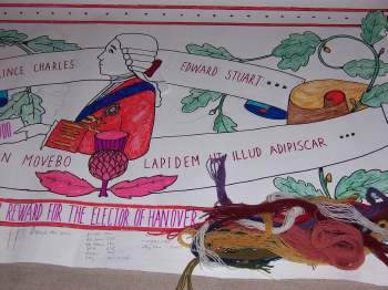 Dunblane's stitchers have volunteered to tackle several panels and whilst they await Andrew Crummy's design for 'sign off' of the Balhaldie House panel, they have commenced already on the Prince's Offer of £30,000 for the Elector of Hanover.