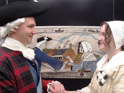 We are delighted to report that Duddingston, on the occasion of the 650th Anniversary of the Sheep Heid, is celebrating the Highlanders' arrival there and the Council the Prince held prior to the battle two days later. The Trust is of course well familiar with events there and conducted its own re-enactment in 2008 of the meeting with Beatrix and Mary Jenkinson. The encounter is pictured above - both as told on the Tapestry and in real life! In real life the Prince is portrayed by Arran Johnston and Beatrix [played by Fiona Campbell] really is his new fiancee. Congratulations!