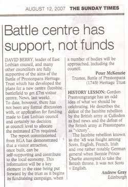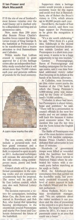 Max Gaunt's RGA Business Feasibility Study for the Trust's proposed Visitor Centre at Meadowmill continues to arouse media interst and brought forth a message of 'personal' support from David Berry, SNP Leader of the East Lothian Coalition Council with the LibDems. Labour have traditionally been in support with a Trustee in former Labour Provost Pat O'Brien who was active personally in the 250th Anniversary Re-enactment in 1995, and East Lothian's Labour MSPs [then] John Home-Robertson and [now] Iain Gray are both wholly behind the campaign.