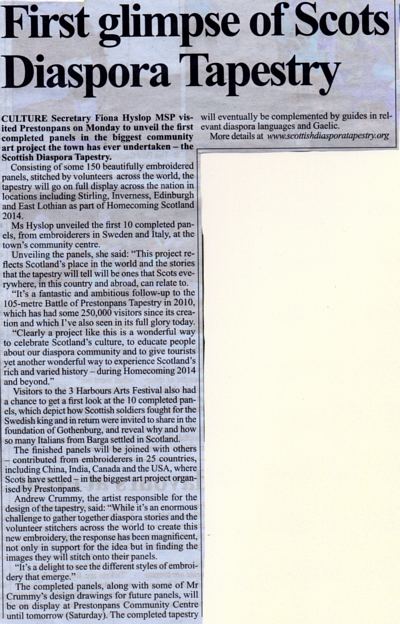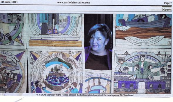 "I am delighted to have the opportunity to spotlight the already impressive start to the project and I very much look forward to seeing the completed tapestry in 2014, when it will be displayed across Scotland in locations that include Stirling, Inverness, Edinburgh and East Lothian as part of the Homecoming celebrations."