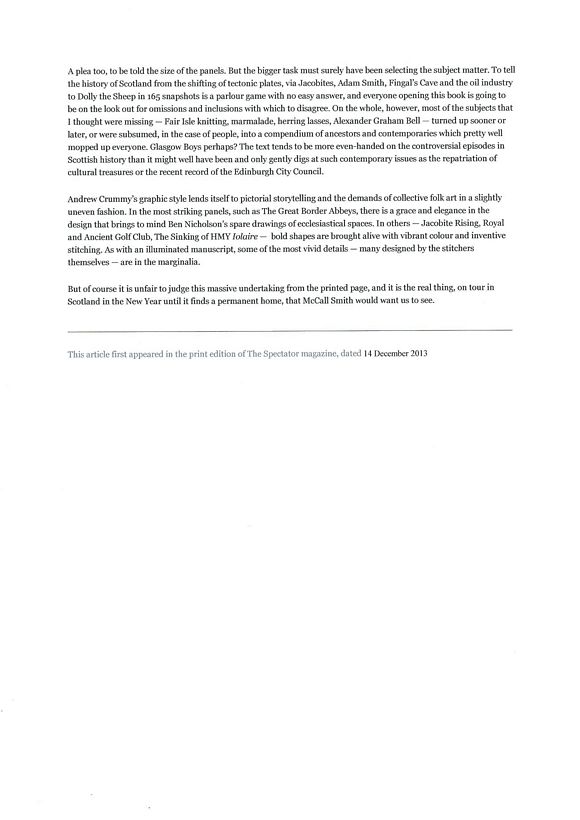 Andrew Crummy's major community artwork inspired by Sandy MacCall-Smith has been rightly admired far and wide since its unveiling in September 2013. Now the volume with all the panels pictured has been published - separately from an excellent earlier book which had described how it had been stitched and the tales of the people who stitched it [The Great Tapestry of Scotland: The Making of a Masterpiece by Susan Mansfield and Alistair Moffat, Birlinn, 2013.]