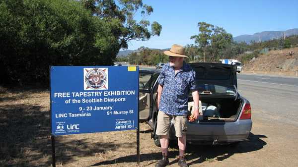 Host Dr Neil McGlashan maximises awareness on the road into Hobart, where the Diaspora Tapestry is now on display at the State Museum and Library, LiNC. This is the third display in Australia after Goolwa and Adelaide held before Christmas in South Australia. It heads for Albury then Sydney, both in New South Wales, when it closes in Hobart before crossing the Tasman Sea to Otago in New Zealand after Easter.