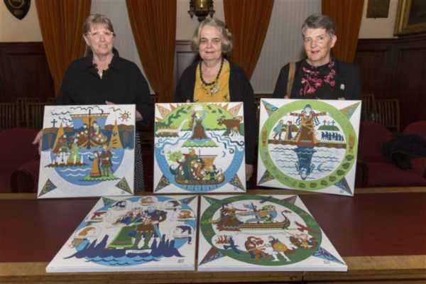 Kristin Gunnarsdottir with the five new Icelandic panels she designed for the Diaspora Tapestry