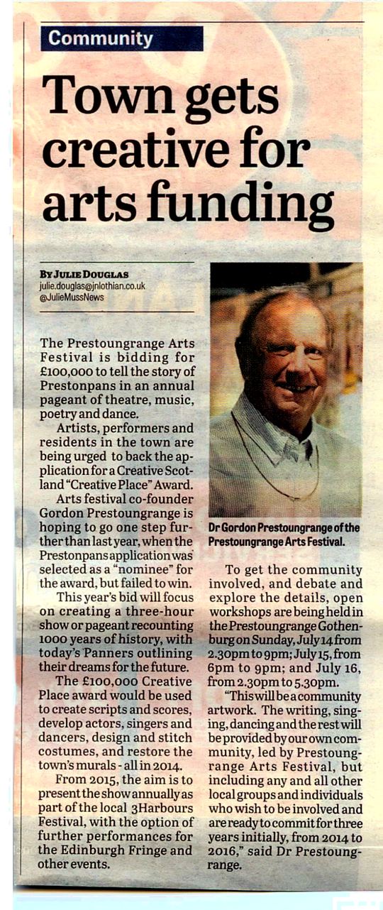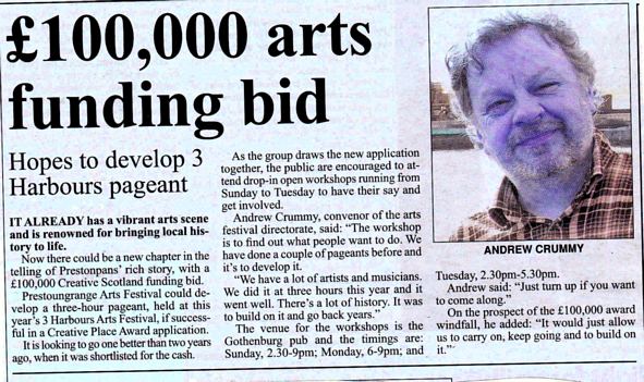 In 2011/ 2012 Prestonpans was 'Nominated' for a Creative Place Award by Creative Scotland but the honour in our category, some £100,000 of arts funding, went to West Kilbride. Good for them. In 2012/ 2013 Huntley won.