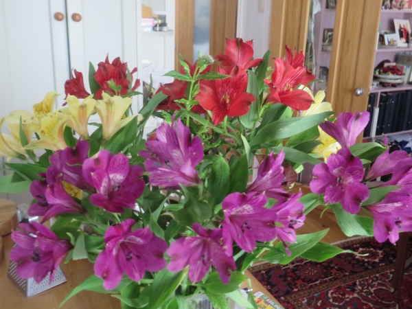 Alstromeria 'waitrosoris' in lactodorum … as pictured are a good gift after the iris blossomed and died so swiftly last week. Commonly called the Peruvian lily or lily of the Incas they last well indoors and are native to South America although some have become naturalized in the United States, Mexico, Australia, New Zealand, Madeira and the Canary Islands. They come all year round in oranges, yellows, yellows/greens, red/purples, purples and whites/ivories - this £7 display from Waitrose in Towcester.