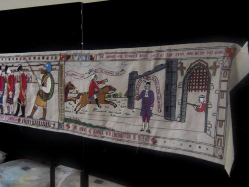 Behind the scenes as the Tapestry has toured to 12,000 visitors thus far at eleven discrete venues there has been continuous 'adjustment'. Mk 1 we all saw on July 26th in The Pans and the official Guidebook photographs Gillian Curtis-Hart took tell that story. During autumn 2010, as the panels developed some mild 'drooping', Mk 2 saw a flexible hemline created for the backing allowing for any necessary future adjustments without having to unpick the panels themselves.