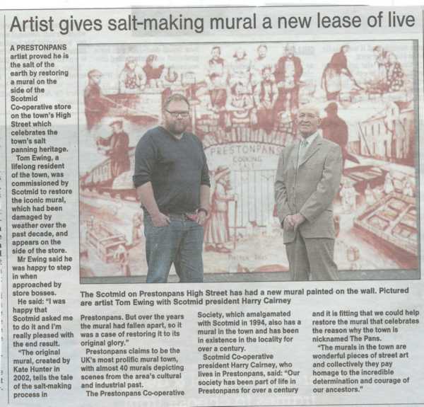 Earlier this year, with support from Scotrail, the murals at Prestonpans Station were restored; then it was the turn of the Witches Murals in the south garden of The Prestoungrange Gothenburg itself; and now, it's Kate Hunter's Salt Mural on the wall of the Scotmid Coop store in town - with the generous support of Scotmid. Thank you!
