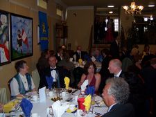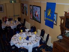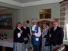 By 7 for 7.30 pm July 23rd, the Lord Mayor and his family and friends were suitably attired in their kilts; and they stand beneath the brass plaque naming the room The Lord Mayor's Bar in honour of his visit on the same date [July 23rd] in 2003. And although it may have been the first time that Jorgen Linder, the Lord Mayor, had donned the tartan it will not be the last [...although he might never appear with Bonnie Prince Charlie again!] He tells that he has every intention of flaunting it back in Goteborg where more than a few descendant diasporic Scots regularly recall their homeland [and within 14 days the photograph below was received showing a kilted Jorgen Londer proudly wearing his Lord Mayor's Silver Chain with The Goetborg Badge at what he described as the "perfect moment" - a Swedish Golf Tournament.]