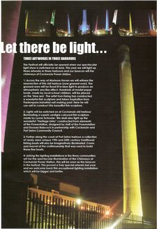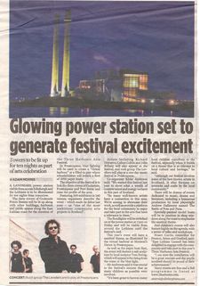 It was an inspired notion at the 2006 Three Harbours Festival to light up the internationally famous Cockenzie Power Station. And now it has been seen again for the first 10 days of June 2007 - with most considerable enhancements. Not for us carping criticism as it delivers necessary power across the nations with, yes, an ageing technology; rather absolute delight in the opportunity it affords to showcase our art in their canteen where over 1000 visitors came during the Festival and purchased art from the exhibitors. And just see those chimneys - what a work of art themselves! Or was it sculpture? {With the new Spanish owners of Scottish Power just imagine what might be in store for us all in 2008 and beyond? Adam Morris' piece already suggests there are three towers so obviously he is privy to Spanish plans already! Ed.]