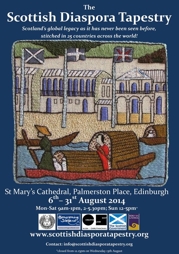 In 2012, the original Prestonpans Tapestry attracted 30,000+ visitors during it's display at St Mary's Episcopal Cathedral. This year it has been the turn of the latest embroidered Pans creation, The Scottish Diaspora Tapestry/ Greis-bhrat Diaspora na h'Alba