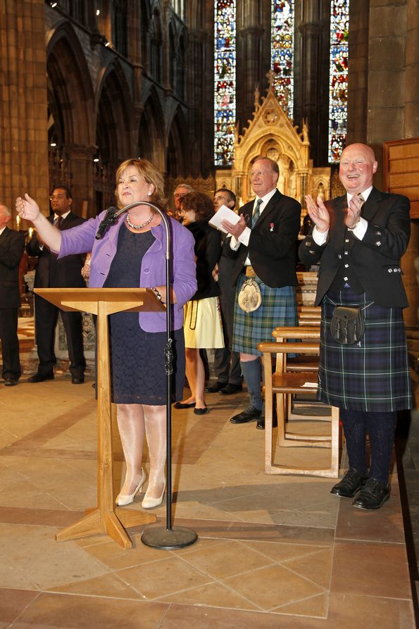 Consuls came to see and provide the canapes, musicians to play and sing ... including Auld Lang Syne from the entire assemblage of more than 400 guests led by Ana Filogonio and surprise and acclaimed guests the Tshwane Gospel Choir from Pretoria. The Consuls were from Ireland, China, India, Italy, Malawi, Norway, Pakistan, Poland, Portugal, Russia, the USA and Iceland - much to the delight of the stitchers and the Cabinet Secretary for External Affairs, Fiona Hyslop MSP, who was also a guest. She spoke with pleasure at what had been achieved and how willingly she has supported its creation recalling several visits in The Pans as the artwork had progressed since 2012. Under her aegis the Scottish Government made significant direct financial contributions to the successful outcome as have Creative Scotland, Bord na Gaidhlig, The Barons Courts and Homecoming 2014.