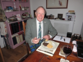 Below The Much Honoured Baron and Lady of Lochnaw dine from Crab on Celery Leaves, Haggis/ neaps and tatties, and finishing with Cranachan chased with Bladnoch Malt, local to the baronial lands at Wigtownshire in Galloway. The wines were West Australian Sauvignon Blanc Sémillon and Chianti Classico.
