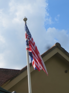 "But there is another foe who occupies large portions of the British Empire, a foe stained with cruelty and greed-the Japanese. I rejoice we can all take a night off today and another day tomorrow. Tomorrow our great Russian allies will also be celebrating victory and after that we must begin the task of rebuilding our hearth and homes, doing our utmost to make this country a land in which all have a chance, in which all have a duty, and we must turn ourselves to fulfill our duty to our own countrymen, and to our gallant allies of the United States who were so foully and treacherously attacked by Japan. [We flew the Stars & Stripes alongside the Union Flag on our pole pictured below.] We will go hand in hand with them. Even if it is a hard struggle we will not be the ones who will fail.”