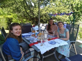 How to celebrate someone else's accomplishments or sacrifices? Certainly the great majority alive today did not win the war or even play a role in it. So thanking those who did who are still living was the right and only thing to do and this 75th is approaching the last time most will still be alive to thank. [Bryan, Anne and I had no role to play other than as evacuees in boarding school, Bryan in Totnes at the Seymour Hotel, Anne at Greens Norton and myself at Tile House, Lillingston Dayrell. Anne recalls being in the gardens eating ice cream and waving Union Jacks.] Those who were involved, veterans, unfailingly tell us that they remember most those who died or were hopelessly injured. It was perhaps ironic we should be doing so in the midst of national lockdown yet for us it worked well... and it seems for many others too. The focus was on families and make do as best we could. Bunting and flags were dug out, 1940s hair styles attempted, red white and blue attire donned and plates of sandwiches and cakes and scones placed neatly on outdoor tables - ours from the Manor House kitchen - thanks as ever to Laura and Jules; and singing the old songs - endlessly!